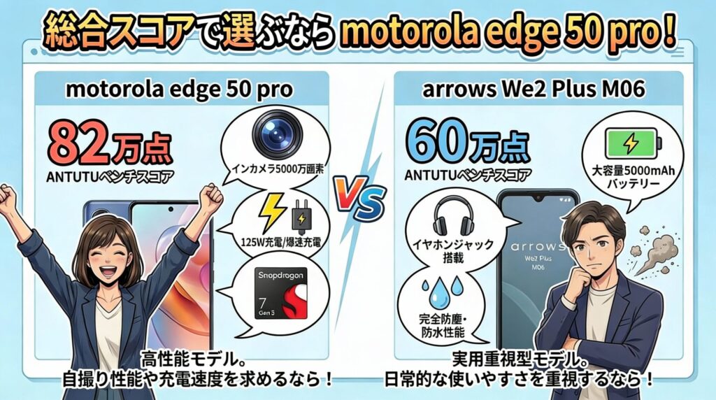 自撮り性能や充電速度を求めるならmotorola edge 50 pro、日常的な使いやすさを重視するならarrows We2 Plus m06がおすすめです。